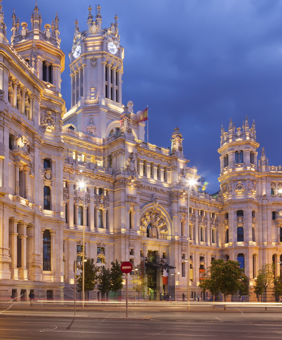 Breakfast, dinner and overnight at hotel. Morning guided city tour, we will visit panoramically some of its main avenues and monumental fountains (Cibeles, Neptuno), as well as the famous and busy “Plaza Mayor” (main square) and old town, visiting inside the Prado Museum, probably the best collection of classic painters of the world. Rest of day at leisure.